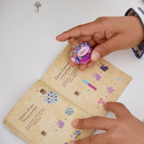Een snufje sterren, een beetje lovertjes en een vleugje kralen! Deze creatieve set maakt het mogelijk om je eigen toverdrankjes in kleine flesjes te maken met behulp van de vele ingrediënten en een toverboek met magische recepten! De set bevat 10 kunststof flesjes met dop, 2 buisjes met zand, 20 acryl kralen, 1 toverstok-bedeltje, 1 sleutel-bedeltje, 1 gouddraad, 1 trechter, 2 zakjes strass- steentjes, 1 zakje lovertjes (3 modellen), 1 zakje sterren, 1 zakje metalen confetti, 1 vel met stickers en 1 toverboekje met recepten. Deze creatieve activiteit helpt bij het ontwikkelen van creativiteit en geduld, en vereist ongeveer 5 minuten per toverdrankje. Ideaal voor kinderen vanaf 7 jaar oud.