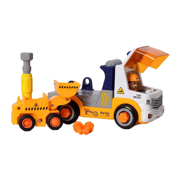 Deze robuuste speelgoedwagen van 27 cm lang is perfect voor kleine monteurs in de dop. Met de bijgeleverde tools kunnen kinderen zelf onderdelen losdraaien, zoals de wielen en andere elementen. Doe er 2 AA-batterijen in en het voertuig maakt echte geluiden: een startsound, een toeter en een vrolijk muziekje. Ook de koplampen lichten dan op!