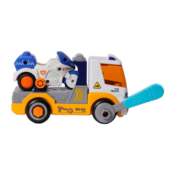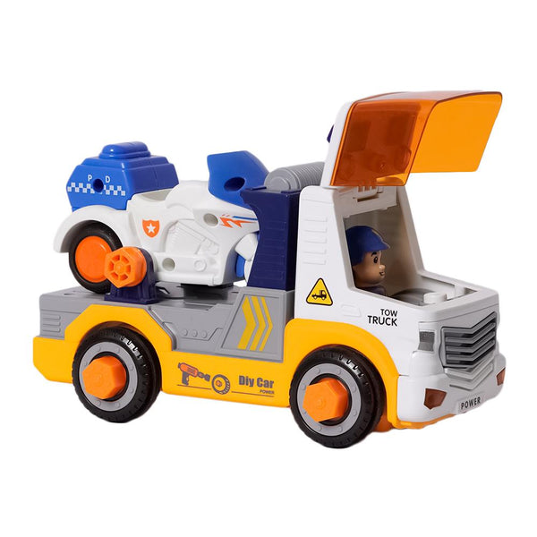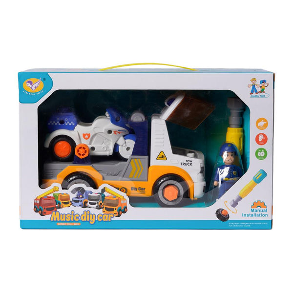 Deze robuuste speelgoedwagen van 27 cm lang is perfect voor kleine monteurs in de dop. Met de bijgeleverde tools kunnen kinderen zelf onderdelen losdraaien, zoals de wielen en andere elementen. Doe er 2 AA-batterijen in en het voertuig maakt echte geluiden: een startsound, een toeter en een vrolijk muziekje. Ook de koplampen lichten dan op!