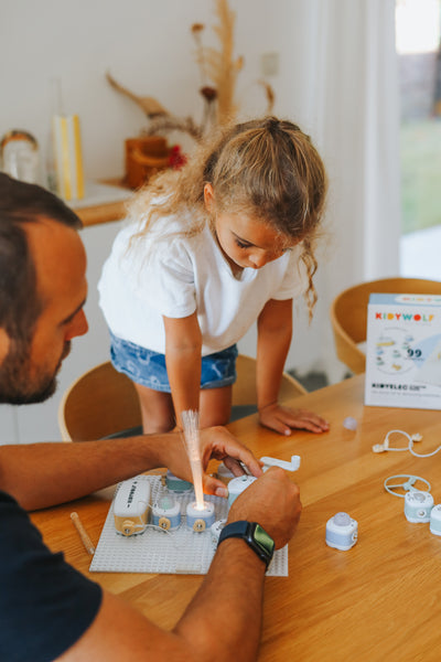 Wat als elektriciteit kinderspel zou worden? Met KIDYELEC ontdekken ze de fascinerende wereld van elektrische circuits door zelf hun eerste montages te bouwen. Ze aansluiten, testen, experimenteren... Deze slimme set is ontworpen om de nieuwsgierigheid te prikkelen en interesse in wetenschap te wekken, en maakt van elke handeling een kleine overwinning. Een eerste concrete en speelse verkenning, waarbij je leert door te zetten — en vooral ook plezier te hebben.
