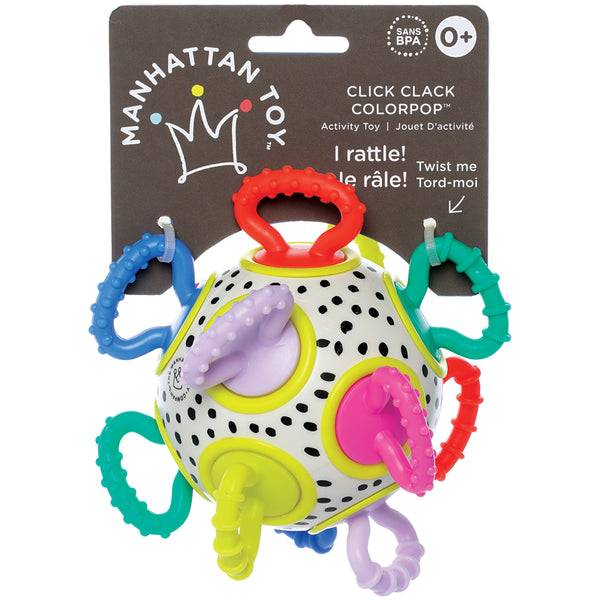 De kleurrijke Click Clack Colorpop heeft zachte plastic handvatten die klikken bij elke draai. De middelste bal is gevuld met kleine kraaltjes, waardoor hij rammelt bij elke schudbeweging. Het perfecte friemelspeeltje voor baby's en peuters!