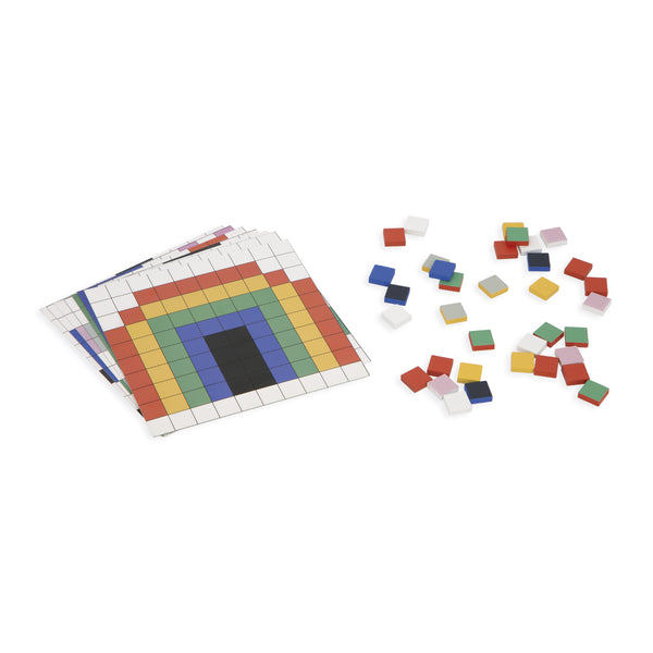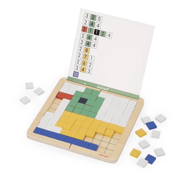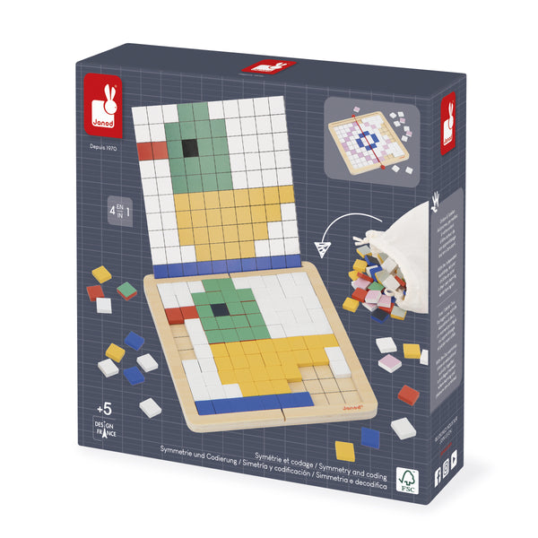 Dit educatieve coderingsspel biedt 4 verschillende spelmodi: 1. Overlapping: Het kind plaatst de steentjes bovenop de kaart op het bord. 2. Reproductie: Het kind plaatst de steentjes op het bord volgens de kaart. 3. Symmetrie: Het kind reproduceert het patroon van de halve kaart door symmetrie. 4. Codering: Met behulp van de cijfers en kleuren die op de kaart staan aangegeven, ontdekt het kind de verborgen afbeelding. Dit spel, dat zelfstandig of in duo kan worden gespeeld, bevordert de ontwikkeling van de concentratie en de kennis van cijfers. Het spel bestaat uit een houten bord, 200 houten fiches en 10 voorbeeldkaarten. Een opbergzak is inbegrepen. Educatief spel van FSTM-hout en karton voor kinderen vanaf 5 jaar.