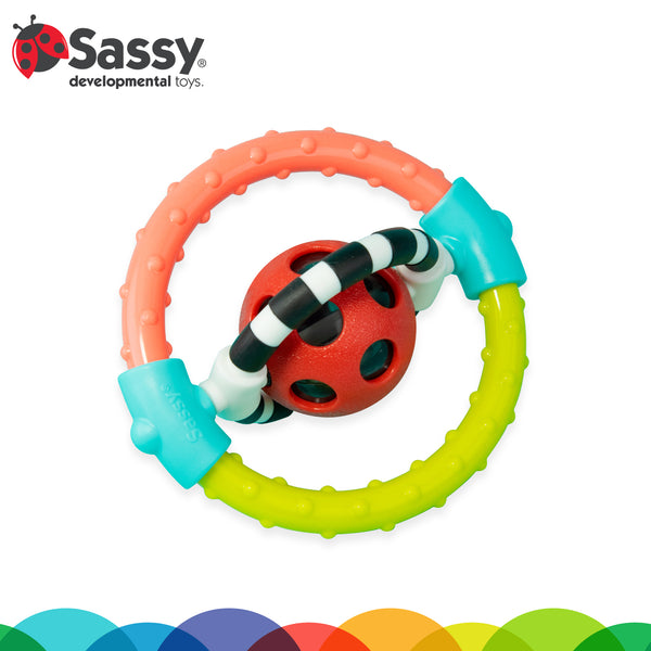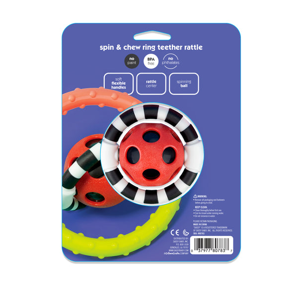 Flexibel, duurzaam en leuk voor je baby om te ontdekken! De zwart-witte ring in het midden draait onafhankelijk van de rammelaar in het midden om je baby aan te moedigen het speeltje te ontdekken. De zachte structuur en de makkelijk vast te pakken vorm maken dit speeltje een favoriet, want je baby pakt, rammelt, schudt en knijpt in dit kleurrijke speeltje.