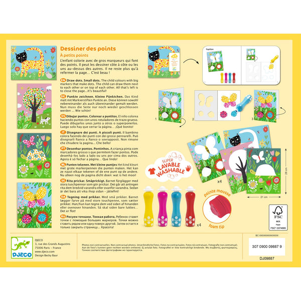 Een eerste kleurset, geschikt voor kinderen vanaf 18 maanden. Met grote schuimstiften kleurt het kind, puntje voor puntje, de silhouetten van de dieren en de boom in. Ze kunnen puntjes naast elkaar of boven elkaar zetten om kleurrijke scènes te creëren. Daarna hoeven ze alleen nog maar het zakje dicht te doen en de mooie plaatjes te ontdekken.
