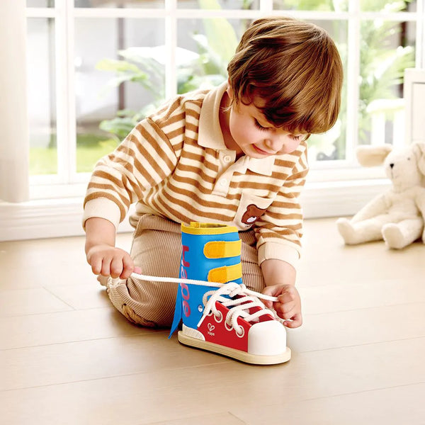 De Tie-It Lacing Sneaker van Hape is dé kleurrijke en leerzame schoen waarmee kinderen vanaf 3 jaar spelenderwijs leren veters strikken én omgaan met andere sluitingen. Deze duurzame oefenschoen biedt vier verschillende sluitmethodes – veters, klittenband, rits en drukknopen – waarmee jonge kinderen stap voor stap essentiële vaardigheden ontwikkelen.