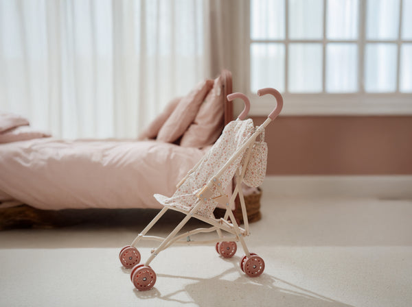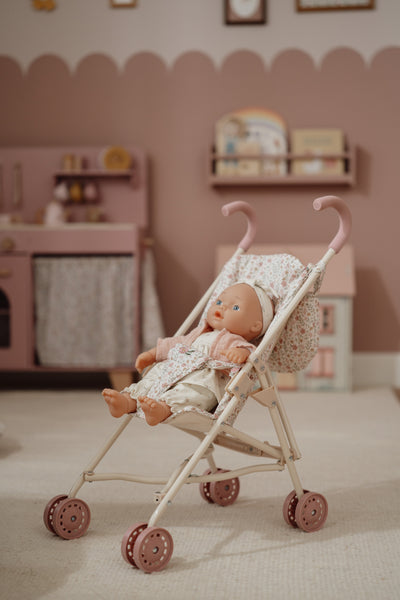 Deze metalen poppenbuggy is perfect voor avonturen met jouw babypop. Met een stevig off-white frame, roze details en een zitting in het vrolijke Soft Flowers-dessin is deze buggy niet alleen praktisch, maar ook prachtig om te zien. De veiligheidsgordel zorgt ervoor dat je pop stevig blijft zitten, zelfs tijdens de wildste wandelingen. Een handig opbergtasje aan het handvat biedt ruimte voor poppenspulletjes, zodat je alles bij de hand hebt voor een fijne dag onderweg met je pop.
