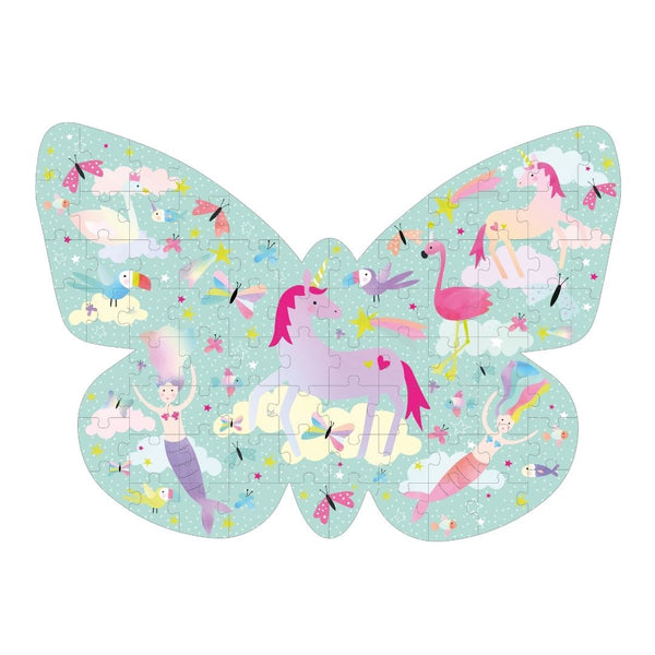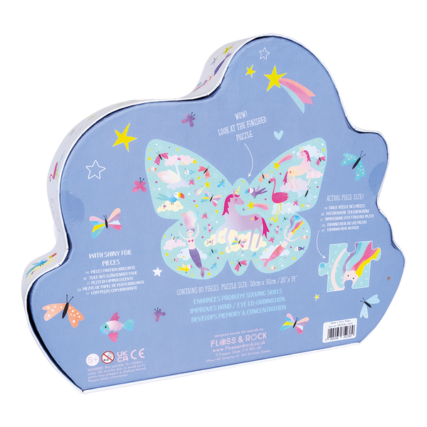 Niet alleen de doos heeft deze vorm, maar de puzzel zelf ook! Deze puzzel van 80 stukjes vormt een vlinder en is voorzien van alle prachtige afbeeldingen uit ons razend populaire fantasiethema. Zowel de doos als de losse stukjes zijn afgewerkt met metallic folie, wat dit cadeau een extra speciaal tintje geeft.